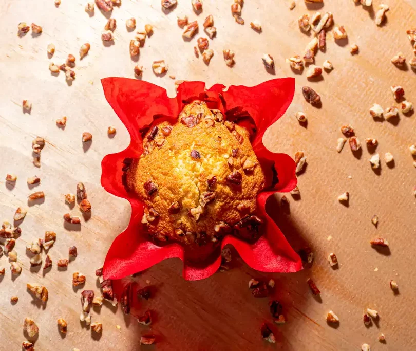 Pan suave y esponjoso, elaborado con una mezcla de vainilla y trozos de nuez, de sabor ligero y aroma irresistible