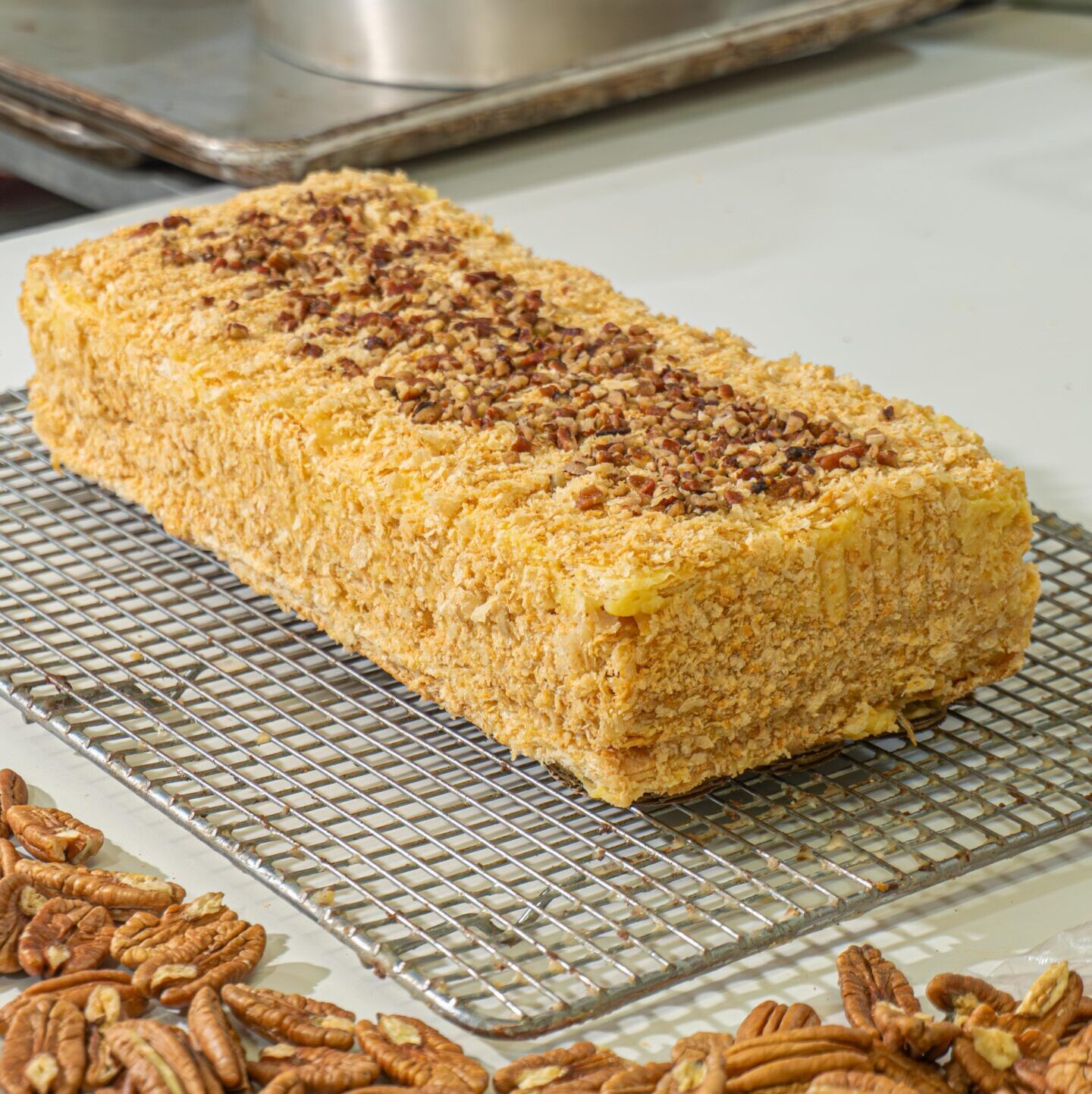 Cuatro capas de hojaldre crujiente rellenas de crema pastelera, cubiertas con hojaldre molido y decoradas con nuez