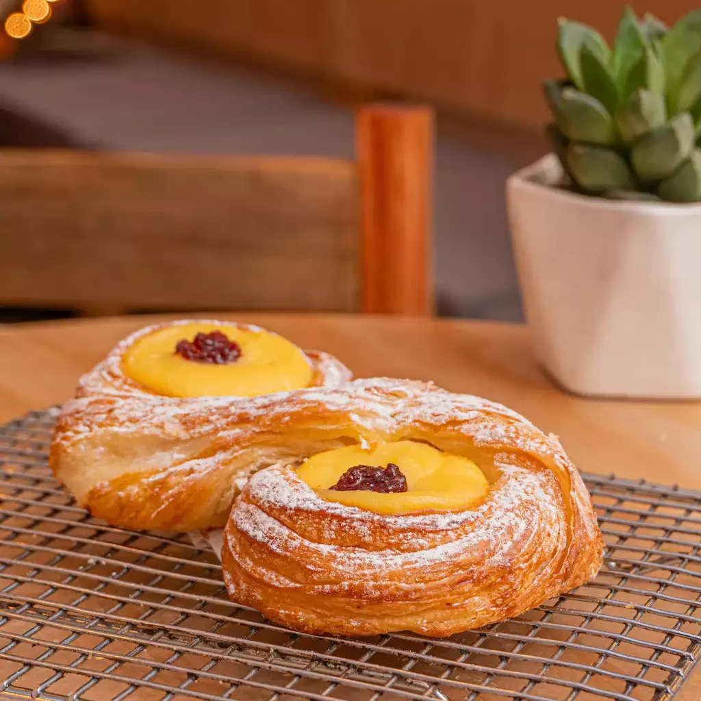 Elaborado con masa a base de mantequilla, relleno de crema pastelera, espolvoreado con azúcar glass y un toque de mermelada de zarzamora